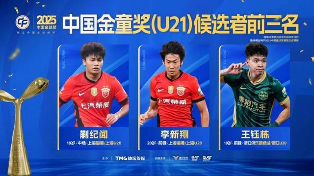 中国金童奖的激烈竞争尤为引人关注。经评委投票,蒯纪闻、李新翔和王钰栋在金童奖U21组别排名前三。其中,蒯纪闻和王钰栋刚刚随U23国家队一起杀入亚洲杯决赛,而他们的国字号队友徐彬、吾米提江和杨希也入围了2025中国金童奖(U21)的候选序列,最终分列评选的第4、第6和第8位。